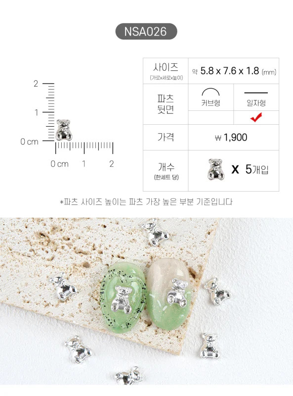 Ezüst színű, macis körömdísz. 5 db Mérete: 5.8 x 7.6 x 1.8 mm