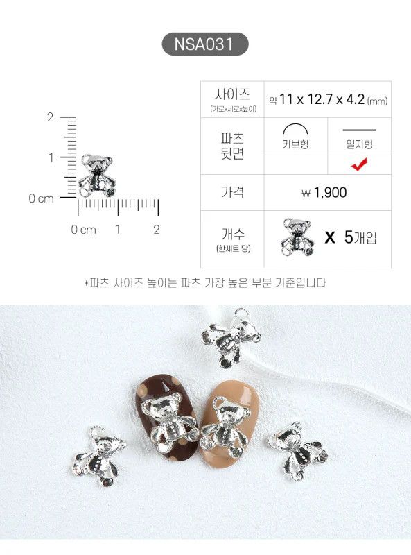 Ezüst színű, macis körömdísz. 5 db Mérete: 11 x 12.7 x 4.2 mm